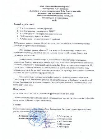 Тамақтану сапасын бақылау жөніндегі бракераждық комиссияның актісі