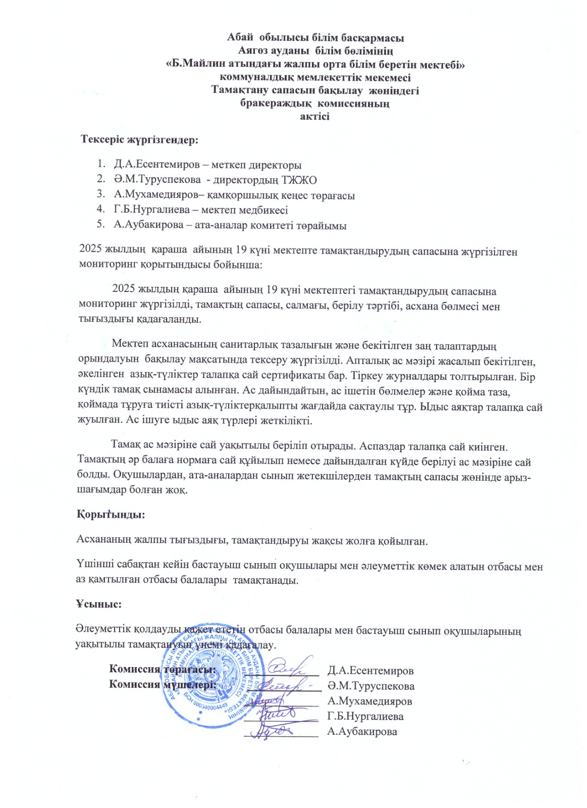 » Тамақтану сапасын бақылау жөніндегі бракераждық комиссияның актсі